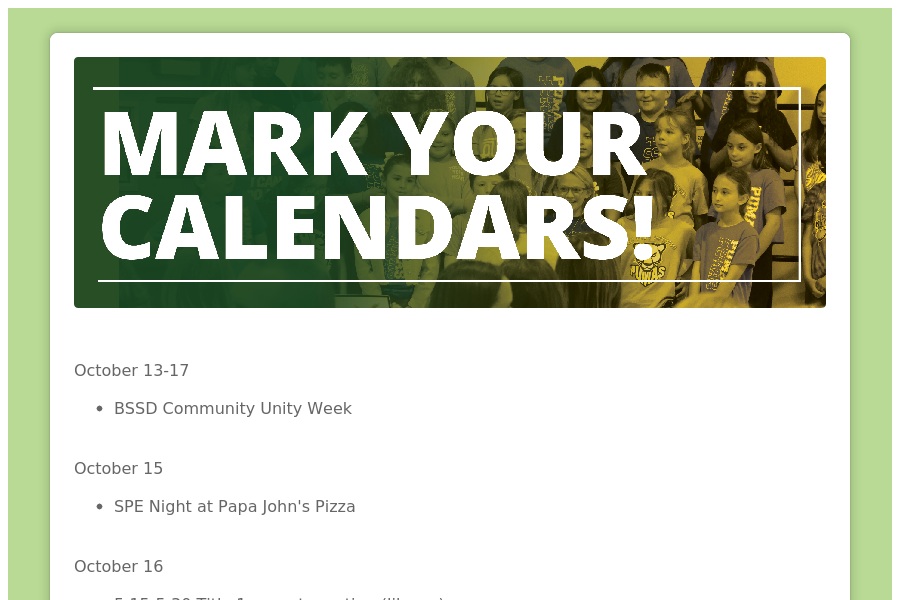 October 13-17 BSSD Community Unity Week October 15 SPE Night at Papa John's Pizza October 16 5:15-5:30 Title 1 parent meeting (library) 5:30-6:30 PTA unit meeting (library) 7:00-7:. . .